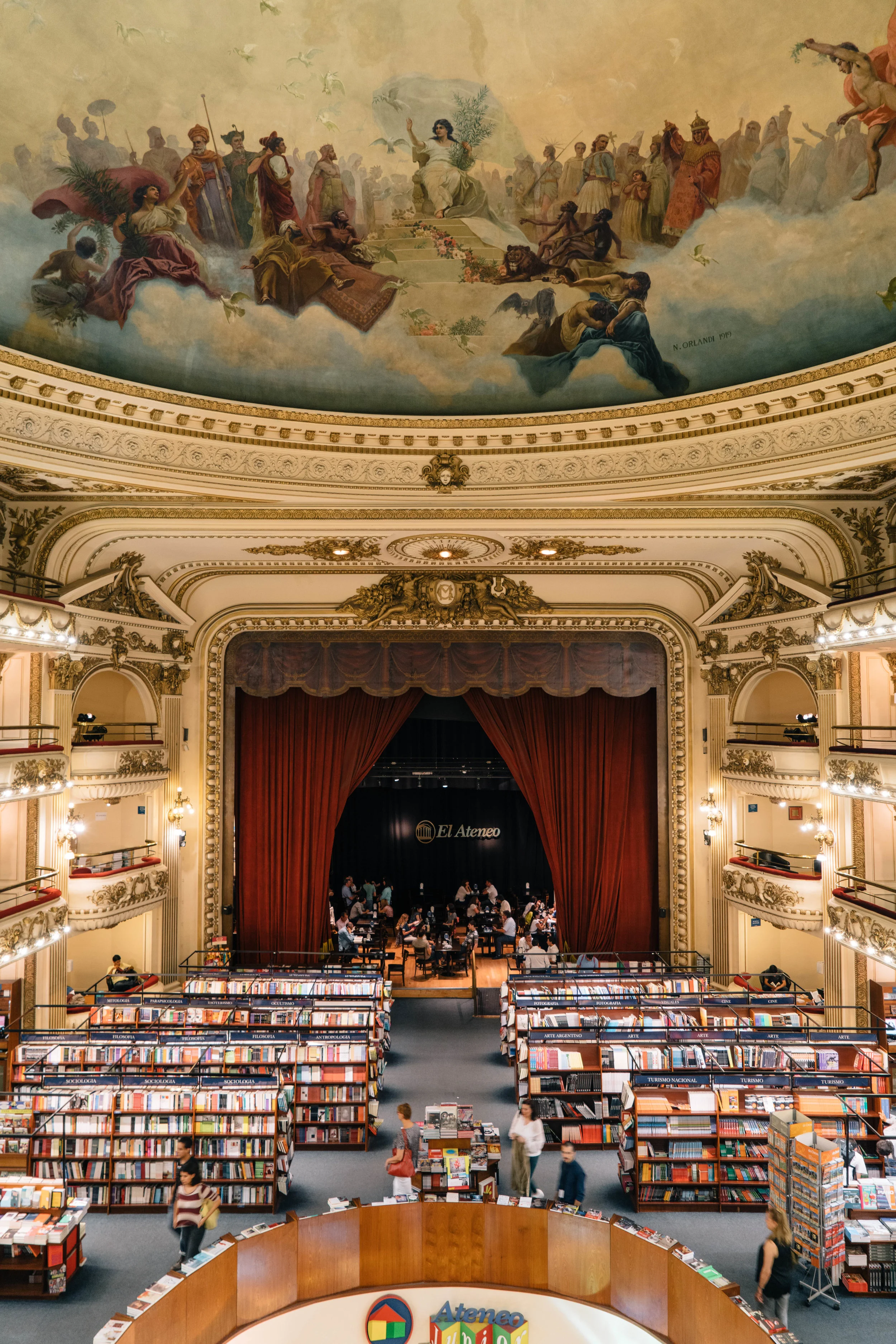 In this visit, our beloved Barnes and Noble bookstore and Starbucks combo got swept under the rug for a moment. The El Ateneo Grand Splendid is the most gorgeous weβve ever seen. Imagine frescoed ceilings, elegant theater boxes, and ornate balconies. In the middle is a grand stage with deep red curtains, which now serves as a cafΓ©. The El Ateneo was built in 1919 as a performing arts theater, then it was turned into a cinema, and now finally converted to a bookstore. For all you booklovers out there this one surely wonβt disappoint.